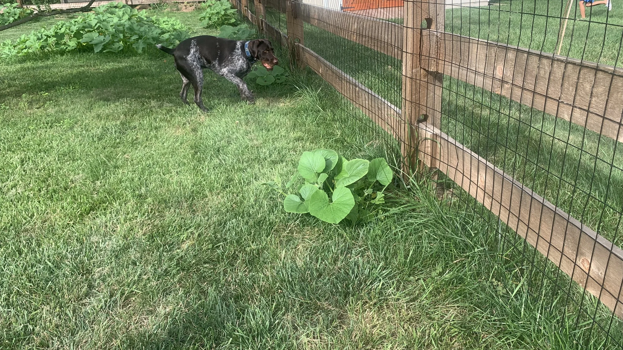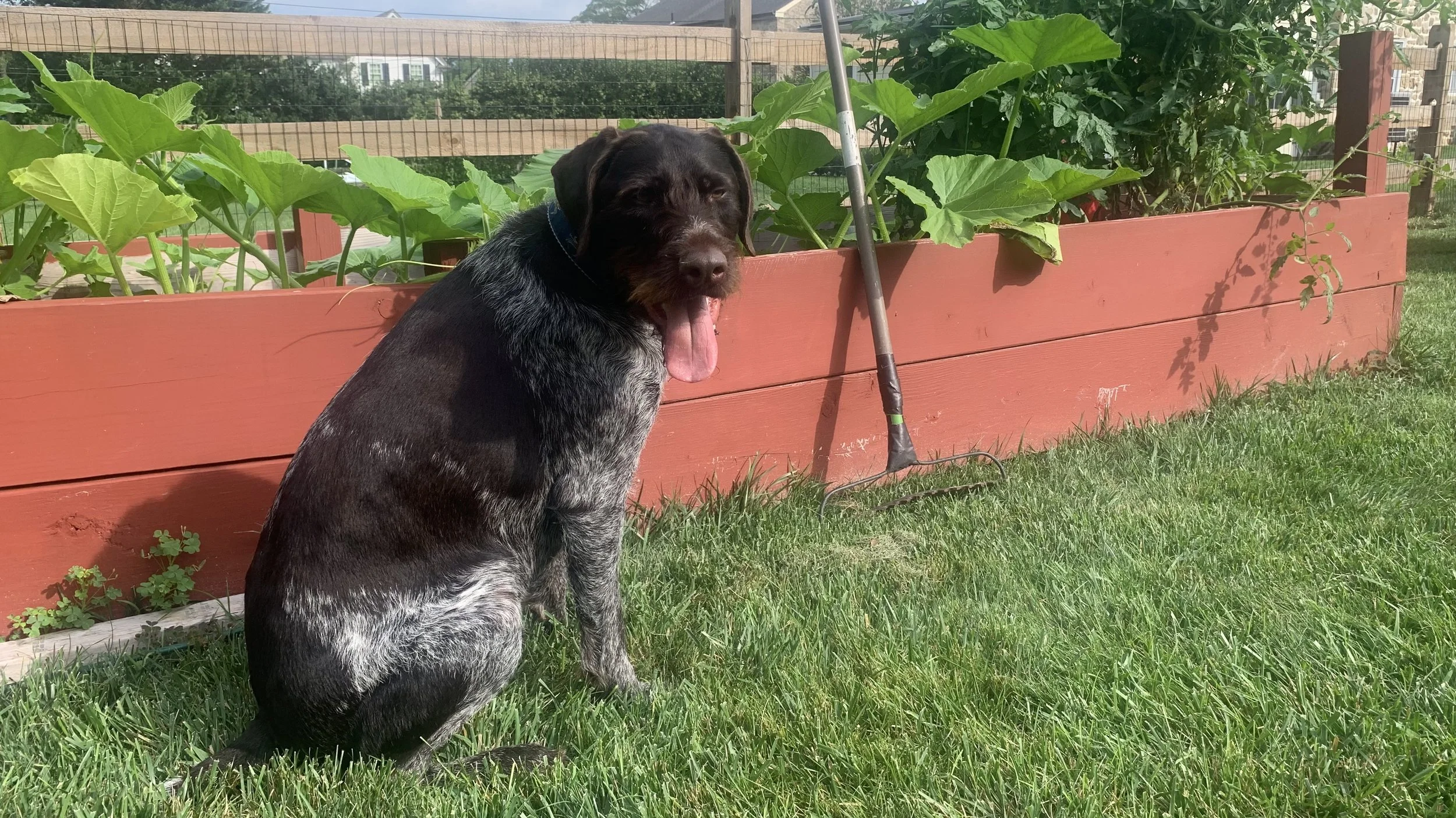 Summer is in full swing, and things are buzzing—literally—here at Otto’s Pumpkin Patch, where our resident garden guardian, Otto the German Wirehaired Pointer, keeps a watchful eye on everything from bees to budding vines.